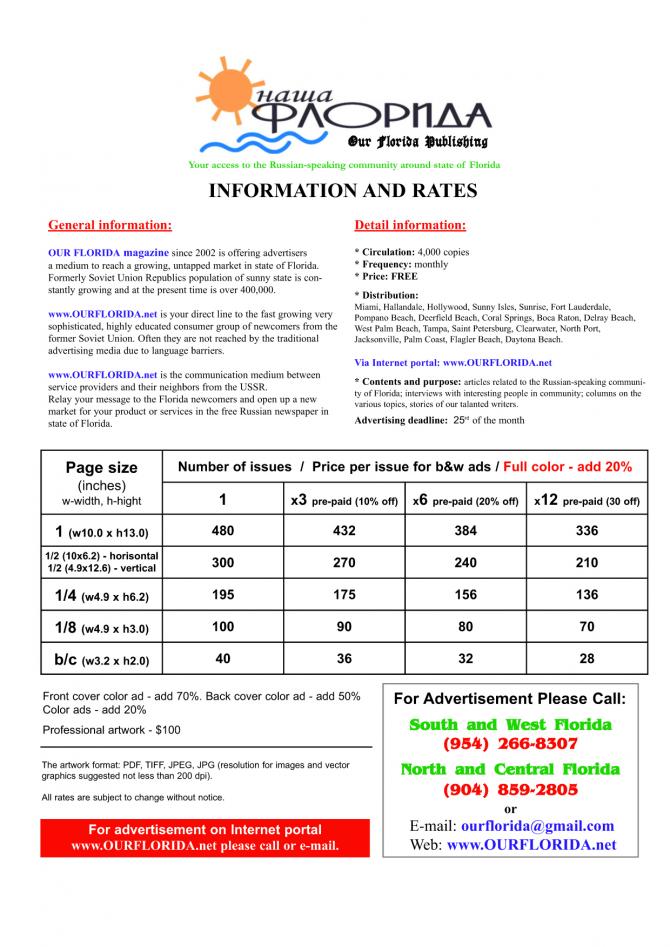 Подписка: На газету можно подписаться на год (12 выпусков). Стоимость подписки $30. Оплата: Zelle transfer (904-859-2805) |